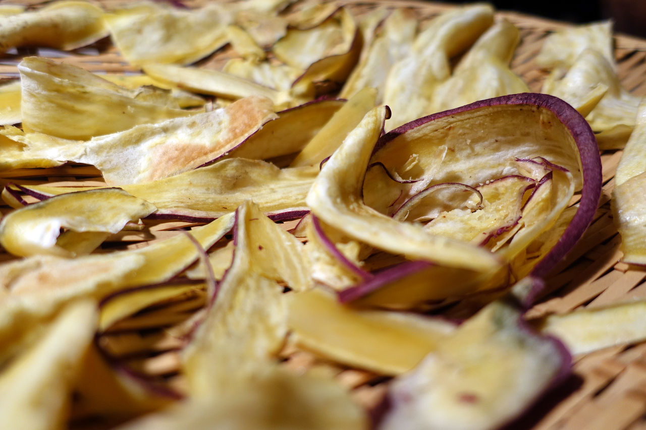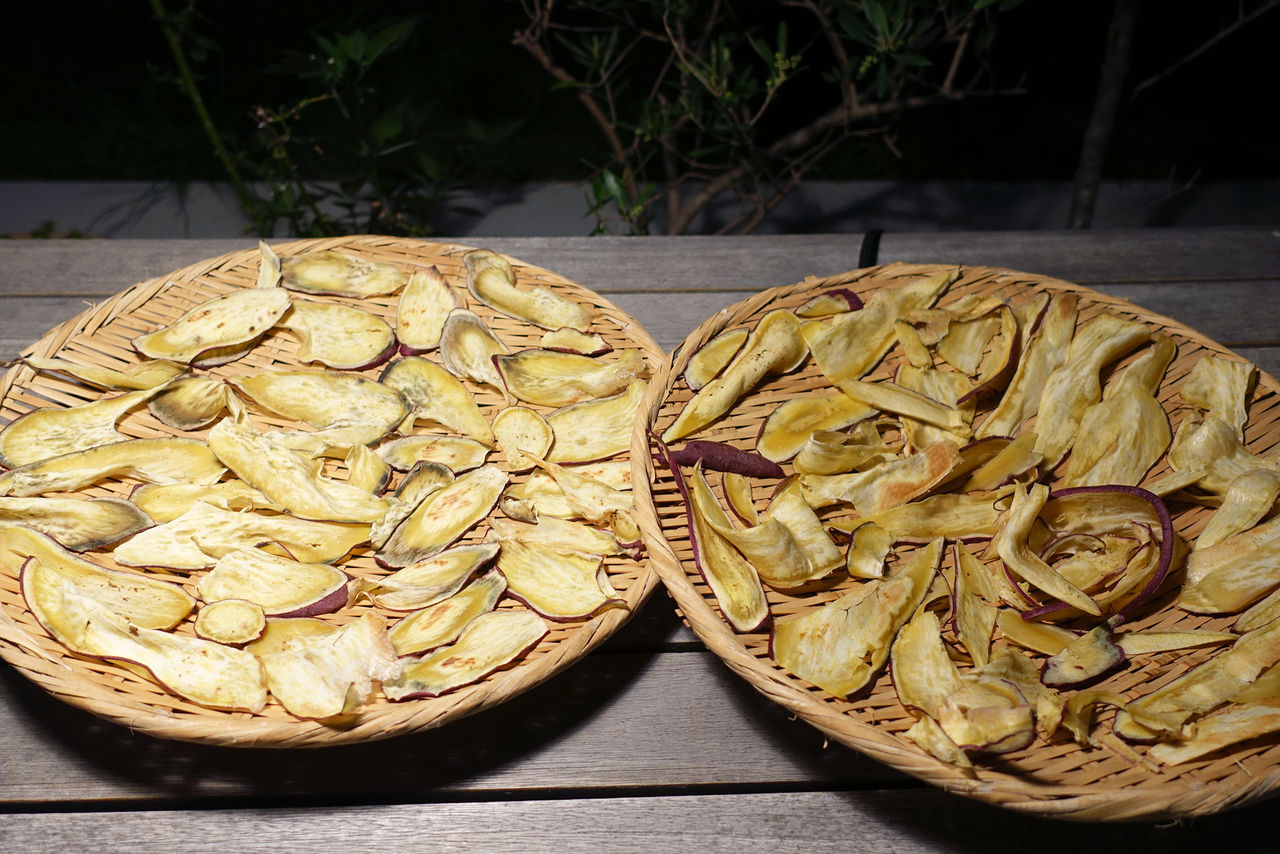 庭のテーブルに各種スライスが並びます。